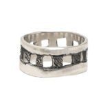Anillo artesanal elaborado en plata de ley 925, con un elegante acabado en plata blanca y texturas orgánicas que le aportan un estilo moderno y natural.