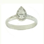 Realizado en oro blanco 18 kt, presenta una circonita central de corte baguette, rodeada por un delicado halo de diamantes talla brillante que realzan su brillo y aportan profundidad al conjunto. El engarce y los detalles laterales acompañan la piedra principal, logrando un equilibrio armonioso y refinado.