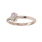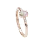 Confeccionado en oro rosa 18 kt, presenta una turmalina natural central de corte oval, cuyos matices aportan profundidad y personalidad a la pieza. El diseño se completa con diamantes talla brillante engarzados en los laterales, que suman brillo de forma equilibrada y realzan la piedra principal sin quitarle protagonismo.