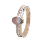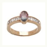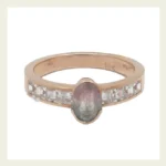 Confeccionado en oro rosa 18 kt, presenta una turmalina central de forma oval, que aporta profundidad y matices únicos de color. El diseño se completa con circonitas engarzadas en los laterales, que suman brillo y acompañan la piedra principal de manera armónica, sin quitarle protagonismo.