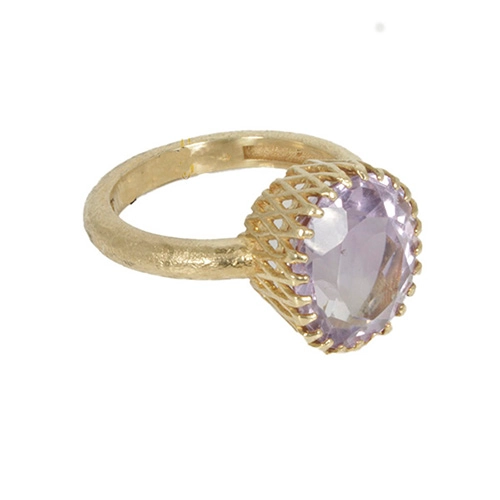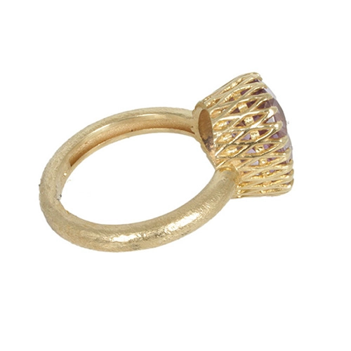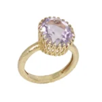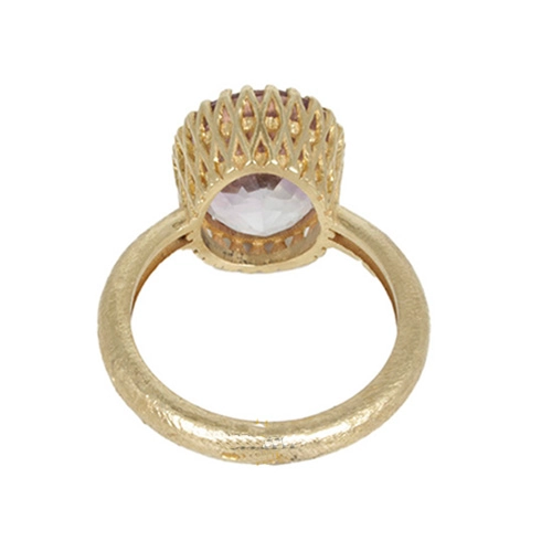 Realizado en oro amarillo 18 kt, presenta una amatista central de gran tamaño, de corte oval, montada en una elaborada estructura tipo canasta que realza la piedra y permite el paso de la luz, intensificando su color y brillo. Su diseño robusto y elegante lo convierte en una pieza ideal como anillo de compromiso con color o como joya protagonista para ocasiones especiales.