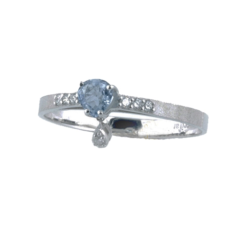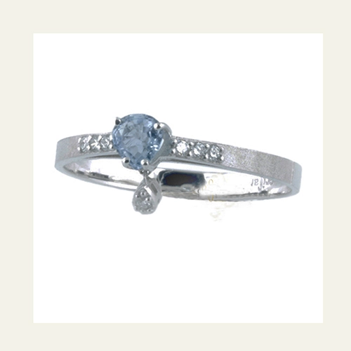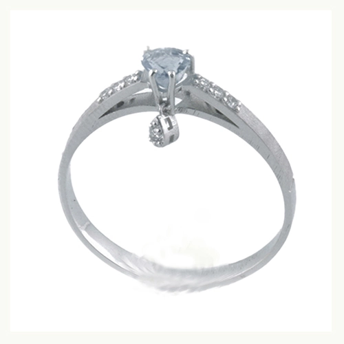 Realizado en oro blanco 18 kt, presenta una aguamarina central de corte lágrima, que aporta luminosidad y suavidad al diseño. La piedra principal se acompaña de circonitas talla brillante engarzadas en los laterales, que suman brillo de manera equilibrada sin restar protagonismo.