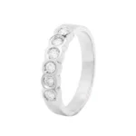 Media alianza en oro blanco de 18 quilates con seis diamantes talla brillante. Un diseño elegante y atemporal, ideal para sellar momentos especiales o acompañar un anillo de compromiso.
